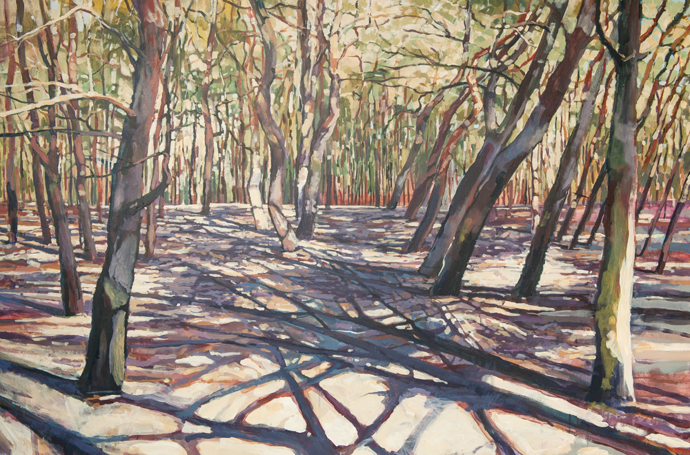 Ósmy obraz z cyklu Prześwity. Cykl Prześwity powstawał w latach 2013-19. Przedstawia fascynację autorki światłem w nadmorskim lesie wydmowym.