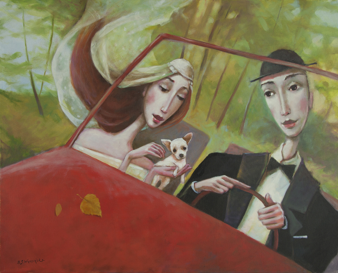 Obraz "Ulubieniec" autorstwa Beaty Wrzesińskiej jest malarskim dziełem pełnym subtelności i emocji. Na pierwszy rzut oka widzimy czerwony samochód kabriolet, który od razu przyciąga uwagę swoją intensywną barwą. Wewnątrz pojazdu znajdują się dwie postacie - kobieta i mężczyzna.
